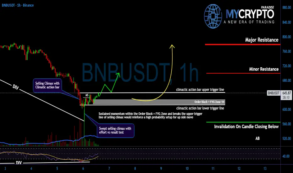 Yello Paradisers! Are you watching this closely enough? Because #BNB formed a selling climax followed by a climactic action candle, and if you're not prepared, you might miss out on a huge opportunity. Additionally, we are seeing selling climax has been swept by effort vs result test, a classic probability that institutional buyers are stepping in. This is where things start to get exciting.