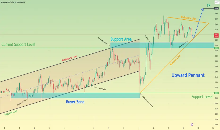 Hello traders, I want share with you my opinion about Binance Coin. By observing the chart, we can see that the price a few days ago started to rise in an upward channel, where it first broke the 228 support level, which coincided with the buyer zone. Some time ago, BNB made a correction to the support line of the channel and then bounced to the resistance line. After this, the price rebounded and fell to the 228 support level, which coincided with the support line of the pennant, thereby exiting from the channel. Next, the price rebounded from this line and made a strong upward impulse to the resistance line of the pennant, breaking the 245 level. Also then, BNB corrected to the support area and a not long time ago continued to rise near the support line of the pennant. And now, I think that Binance Coin can rebound from the support line and rise to the resistance line of the pennant. After this, BNB can break this line, thereby exiting from the pennant and then continuing to move up. For this case, I set up my target at the 260 level. Please share this idea with your friends and click Boost 🚀