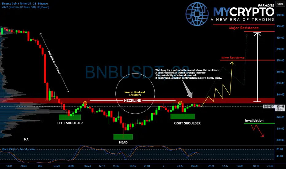 💎This structure forms after a sharp downtrend and often acts as a springboard for upside momentum when confirmed. If #BNB manages to break and hold above the neckline with volume, the next target lies near $870, minor resistance, with the $890–$900 zone acting as major resistance.