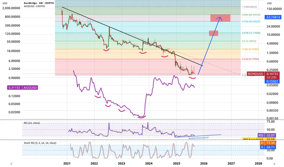 BOND is trying to form a bottom. Price is in oversold range with bullish divergence and pattern is similar to AIOZ before it reversed. Once it bounces up it can move very fast so it's possible to break diagonal resistance line and push on without testing. Looking for test of fibb 0.786 range but move can stop also at fibb 0.618 so DCA profits out on the way up...