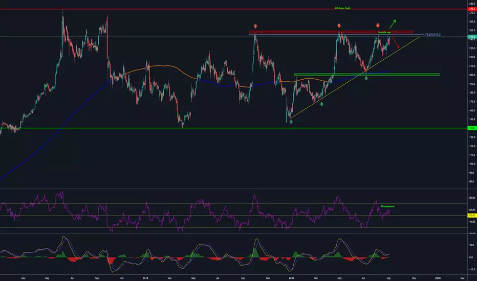 Seems like a double top now with divergence, potential to short with great risk-reward. A long would only be considered if we close above 250.