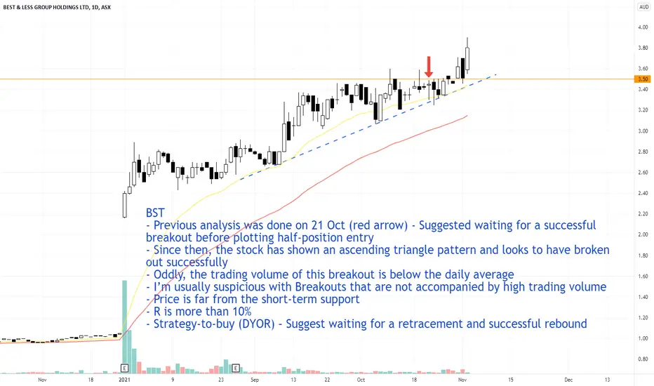 - Previous analysis was done on 14 Oct (red arrow) - Suggested waiting for a successful breakout before plotting half-position entry