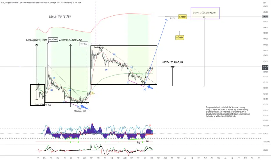 The chart highlights BTAF’s long-term cyclical structure, showing clear Elliott Wave patterns and Fibonacci extensions that point to significant potential upside.