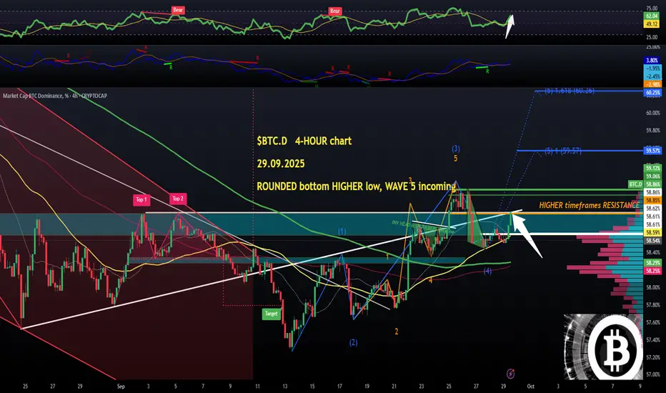 BTC DOMINANCE lower timeframes charts (1 and 4-hour tfs) is just bullish apart from the fact that it still has to cross above last bits of higher timeframes resistance zone (58.85 - 59%).