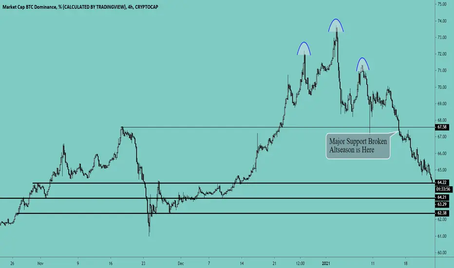 Bitcoin Dominance is now at support. If Bitcoin dominance breaks the current support level of 64.2%, then the next support is 63.3% and the last major support is 62.4%. We will see a huge altseason if Bitcoin breaks 62.4%.