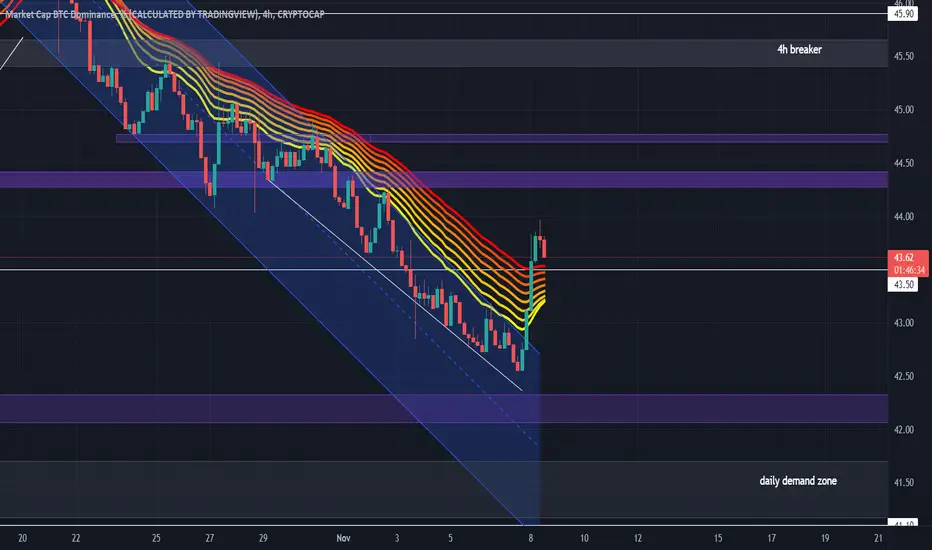 BTC.D finally broke out from the descending channel which we have been waiting for some days now. It also broke through the resistance at 43.5% which i expect it to retest before continuing the move up. We are aiming for the 4h breaker at the moment but it should have no problem breaking through it again.