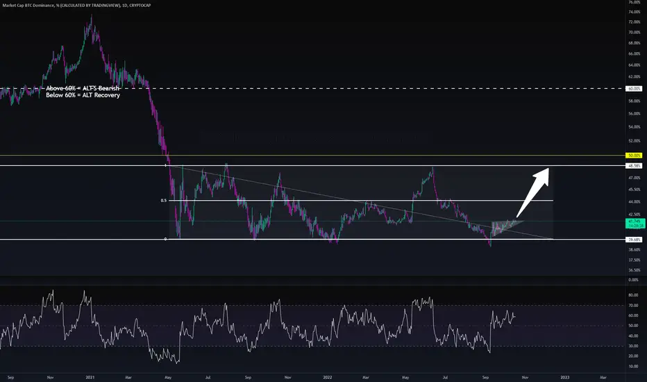 Yet again BTC Dom has bounced off this 40% support level - this can be interpretted many ways the most likely in this case is that BTC will likely be holding its cap (possibly even capital coming into it) whilst money drains out of the wider ALT market. With the USDT dominance looking like it might be dropping there could be a migration of ALT capital into BTC. Remember that when this happens this will "double" the impact of the BTC Dominance so not necessarily menaing that the Bitcoin price is going to fly....at all. Remember the dream scenario is always: