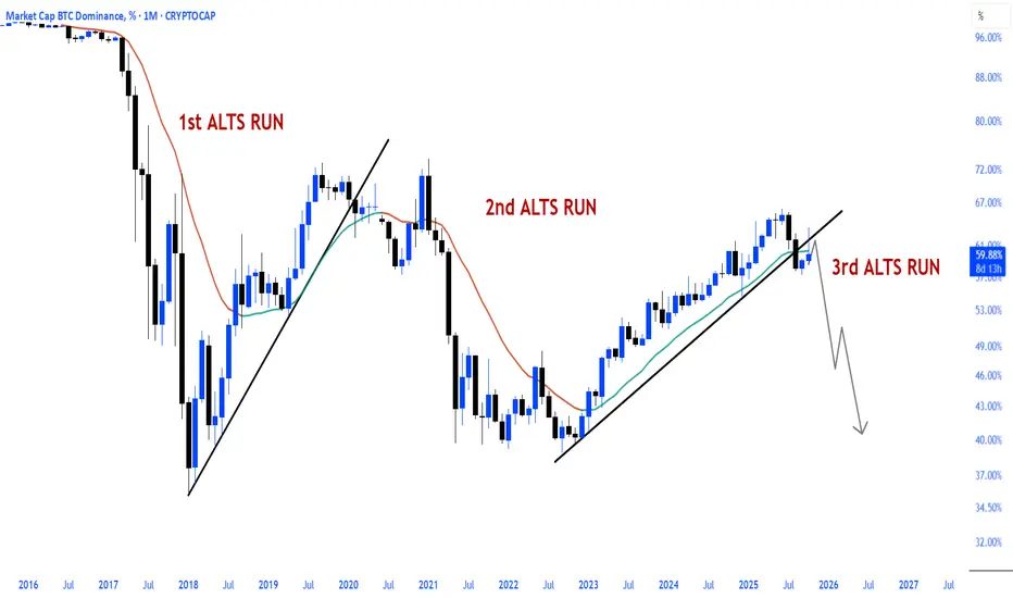 It's important to remember that dominance alone isn't an altseason indicator; the key is for dominance to decline alongside Bitcoin's rise.