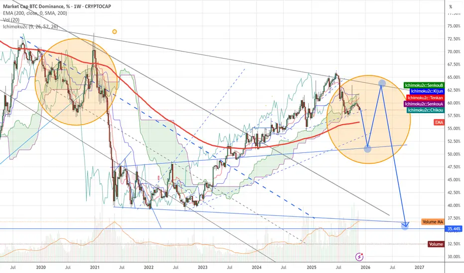I've been following this chart for years, and this is what makes the most sense... I can't comment on what alts are to be expected to gain the most momentum and all, but as far the BTC Dominance chart is concerned, I believe we're going to see a drop to 50% range with BTC reaching new ATH briefly say 128k range by end of January and ALTS getting some love (most starting a new Elliott wave leg 1, 3x gains). Next BTC will crash to below 80k levels while taking all ALTS and the small gains with it (Leg 2, all loss), until say May-Jun... From there a new rally for the ALTS will start similar to 2017 (leg 3, 4 and 5 of Elliott wave 5-6x gains), followed by by BTC rally all the way to mid 2018...