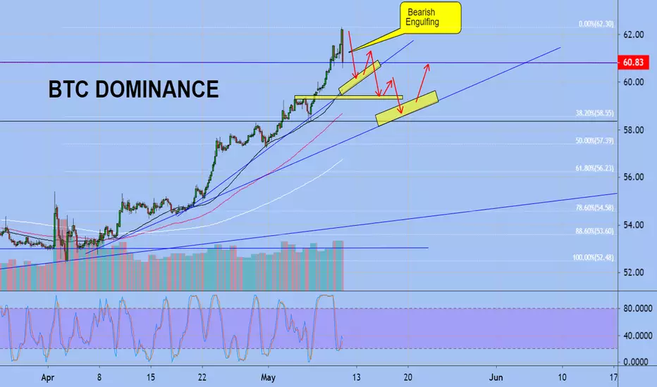 Now we have seen Bearish Engulfing on the chart, which means that bitcoins start to pour into other projects, thus domination of bitcoin falls, as a rule, after such a growth, at least a minimal correction always occurs to roll back for the next tug. I will be watching this important indicator. Now I am waiting for a pullback to 59-58% domination