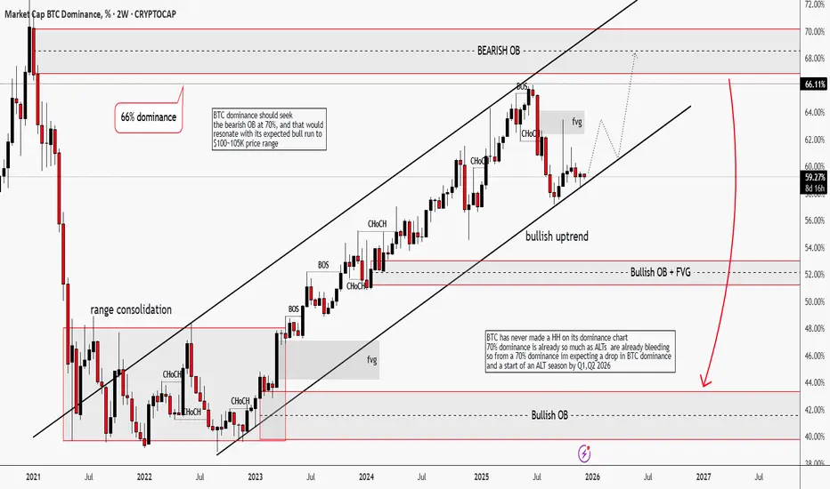 TL;DR: BTC dominance shall drop from the range of the bearish OB 70% which shall align with its projected bull run to $100k-105k price range. After that, we can call for ALT season.