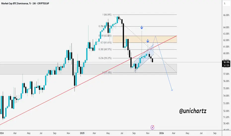 If BTC dominance fails to reclaim this zone with strength, the broader structure points toward continued downside, potentially targeting the 57% level and possibly lower if that support breaks.