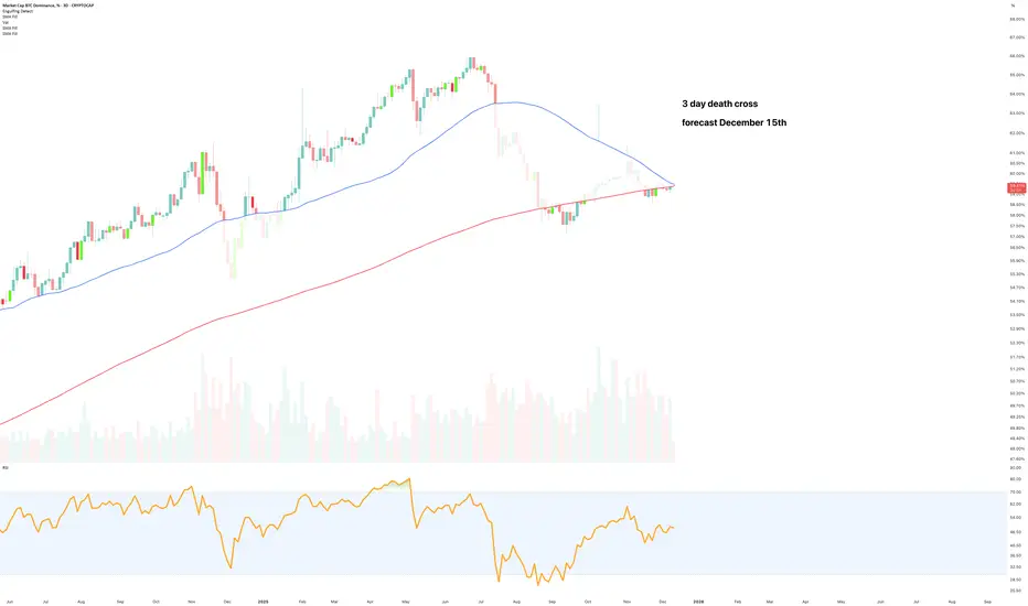 The death cross has printed. It is perfectly normal to see dominance rise until market structure before the big correction. Structure is at 61%, expect this area to be clipped before downtrend continuation.During this period of structure re-test the OTHERS total climb 70% on the previous death cross. And the one before that, that was the 2016 period you wish you'd long'd before 2017.