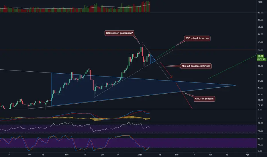 BTC is likely to re-test the main support line of the blue pennant if the alt rally continues. We need BTC to pass the 72% level if we are to aim for 80% or more.