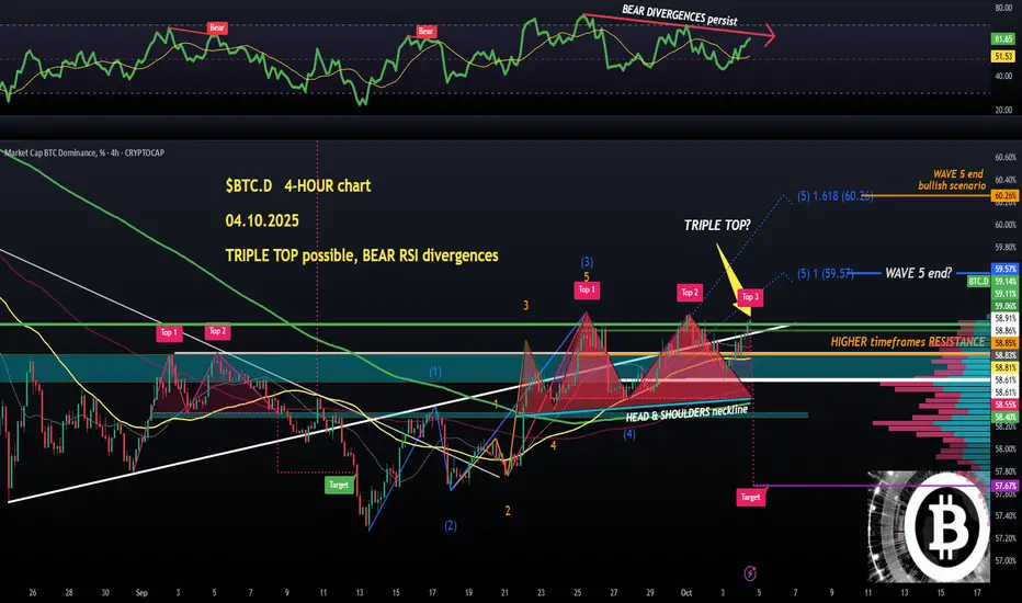 Triple top in confluence with persisting RSI momentum divergences, two in a row in the making, which is basically a confirmation of dying momentum.