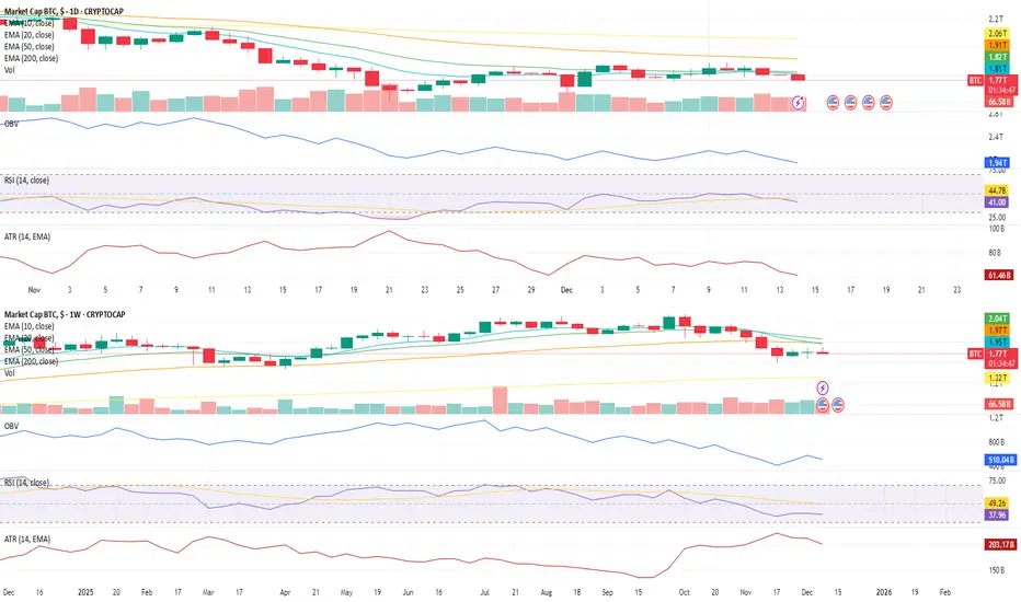The weekly structure confirms that BTC is still digesting prior downside, with no volatility expansion signaling forced liquidation or acceleration.