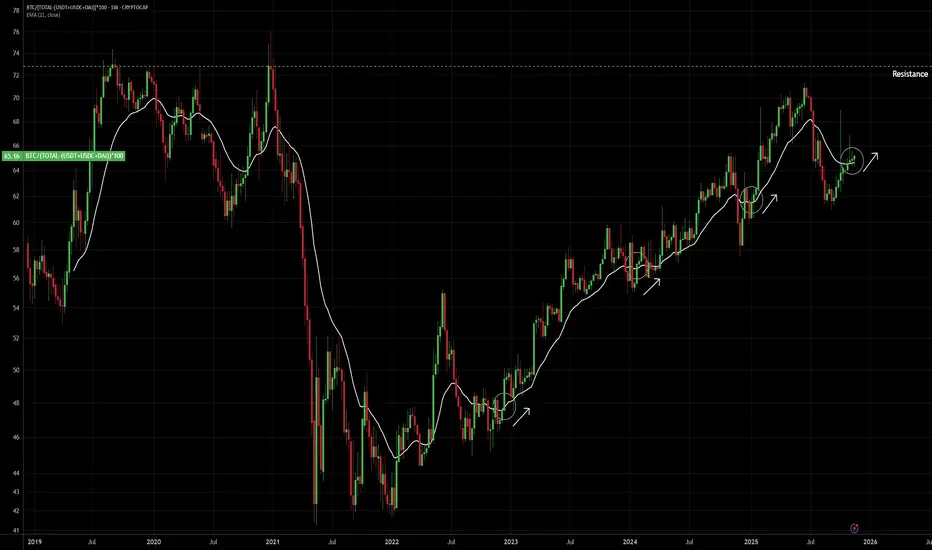 The Real BTC Dominance should be a parameter of BTC market cap divided by the total Actual mcap of ETh and all other coins and tokens. That is how we used to judge the BTC dominance prior to 2020 (in 2020 the stablecoin economy was very small and almost entirely used for buying crypto assets only). Since today the USD stablecoin economy is increased enormously, we need to subtract the market cap of the stablecoins to get the real BTC dominance.