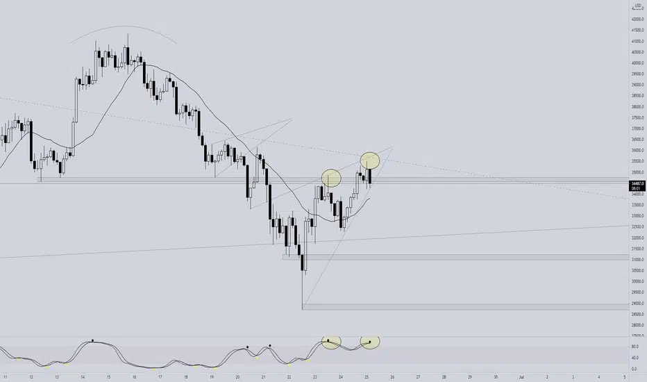 If you look at the momentum oscillator you'll see price action is overbought and has signaled twice now, and the same area on the actual chart is showing strong sell offs during those specific candles which shows sellers are taking control in the short term, plus we're at resistance and have been in a downtrend since ATH's.