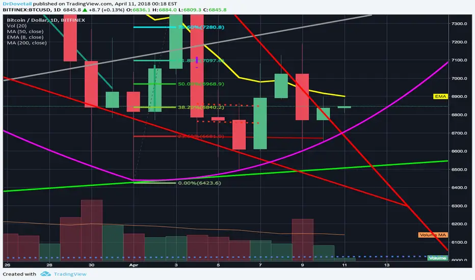 A quick update we are reaching a pivotal point as we approach the apex of this falling wedge as well as continuing to follow this potential eve bottom quite precisely. You can see here on the 1 day chart we are currently up outside the falling wedge on the current 1 day candle...like the previous 1day candle, it is finding strong resistance at the t line(in yellow) However this candle has a double reinforced support of both the eve bottoms trendline, and the 23.60% fibonacci retracement line(in red at 6680). This retracement line has served as both very strong support and very strong resistance over the last week or so as the eve bottom has been slowly rounding out and making its turn back upwards, and now that we are above that fib line as well as having it double reinforced with the eve trendline, should prove to provide enough support to keep the price action up out of the falling wedge...which should result in a big bullish volume spike in the coming few days. It could by chance drop back down into the falling wedge and wait until closer to the end of it to breakout which would invalidate and eve bottom but instead likely result in a more traditional standard double bottom considering the falling wedge ends at the exact same pricepoint as february's low....either way we have good odds in favor of one of the 2 double bottoms so I will side with that probability while at the same time of course being prepared for the exact opposite outcome should it occur, where if we dip and stay below 6400 we can trigger a massive head and shoulders that could take us down as far as the 3,000s(less likely in my opinion) If we can find a way to close above the tline on this current candle I'd say we will likely see a big bullish volume spike to confirm the breakout on the follow up candle..for now we shall wait and see.