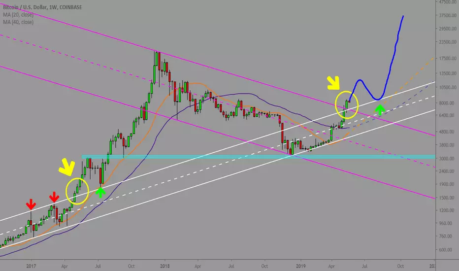 Either way it's going to be great! We got a weekly close significantly over the $7,300 to $7,600 mark I was looking for. This keeps the price over the multi-year trend (top line of white channel). As you can see in the yellow circles the last time this happened the price continued to climb for weeks to follow. Also the 20 and 40 week moving averages are closer to crossing. Another BIG plus. All-in-all the weekly chart speaks for itself. This all looks bullish to me. Not the gloom and doom FUD I keep seeing. Will the price continue to dramatically rise and fall? Sure, you can count on it. But the overall trend is bullish IMO and will remain so for quite some time.