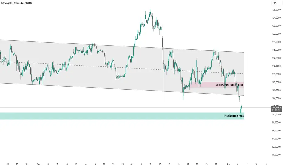 The price has now reached the final support area near $100,000–$101,000, which is currently being tested.