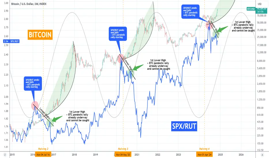 The key characteristic here is the Lower Highs pattern that the ratio forms every Cycle around the Halving time. As you can see, when SPX/RUT peaks (red circle) and starts forming Lower Highs, Bitcoin stars its Parabolic Rally (green arc). On the 1st Lower High, BTC's rally is already underway and has entered the stage where due to the sheer buying pressure and aggression, getting an entry is difficult. The Lower Highs on SPX/RUT also signify a shift from big capitalization stocks to low, i.e. an increasing appetite for riskier assets and that transcends to the Bitcoin market as well.