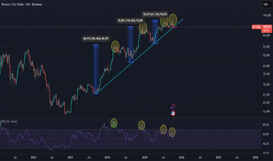 Bitcoin has weakness in the bullish steps on the weekly time frame as well as RSI divergence, if the PRZ support area of $107,000 is broken, there is a possibility of a correction or the start of a range market or bearish trend.