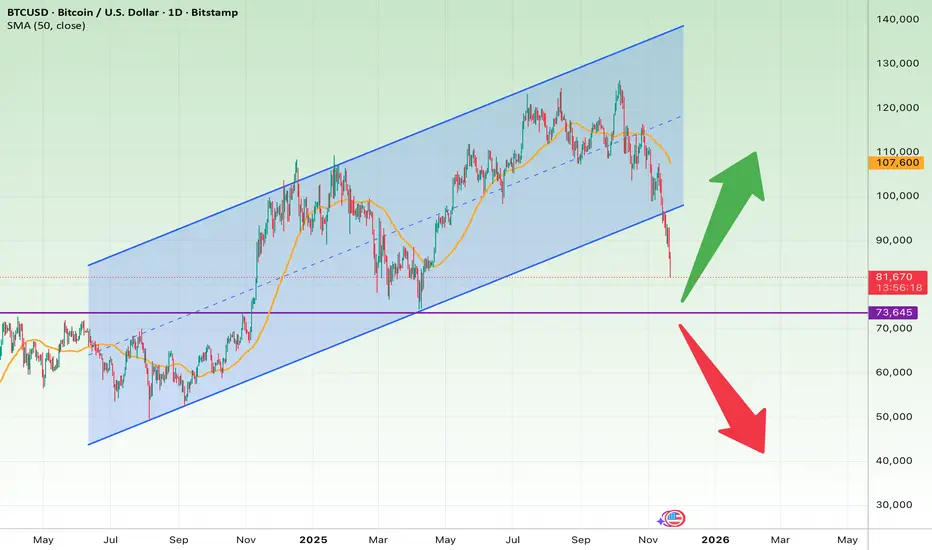 BTC has been trading inside a multi-month ascending channel, but the recent breakdown has pushed price below the lower boundary — a significant technical event.