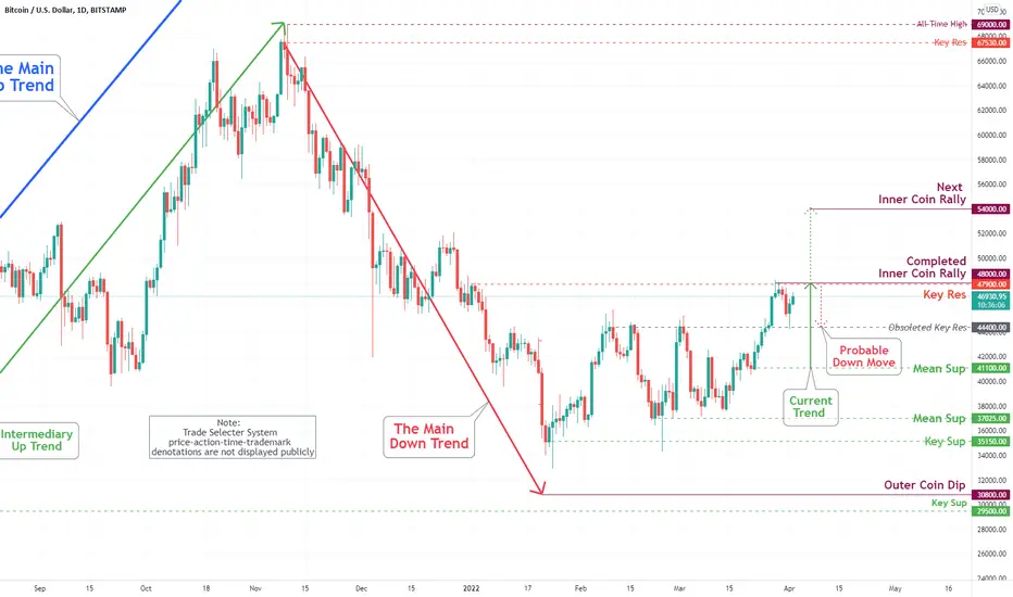 Since Friday, March 25, Bitcoin's Inner Coin Rally $48,000 and Key Res $47,900 were completed, as shown on Daily Chart Analysis For March 25. The retest of the obsoleted Key Res $44,400 is a very low probability however is alive and well. The push to retest the completed Inner Coin Rally at $48,000 and Key Res at $47,900 and move substantially higher to the next Inner Coin Rally at $54,000 is in the cards.