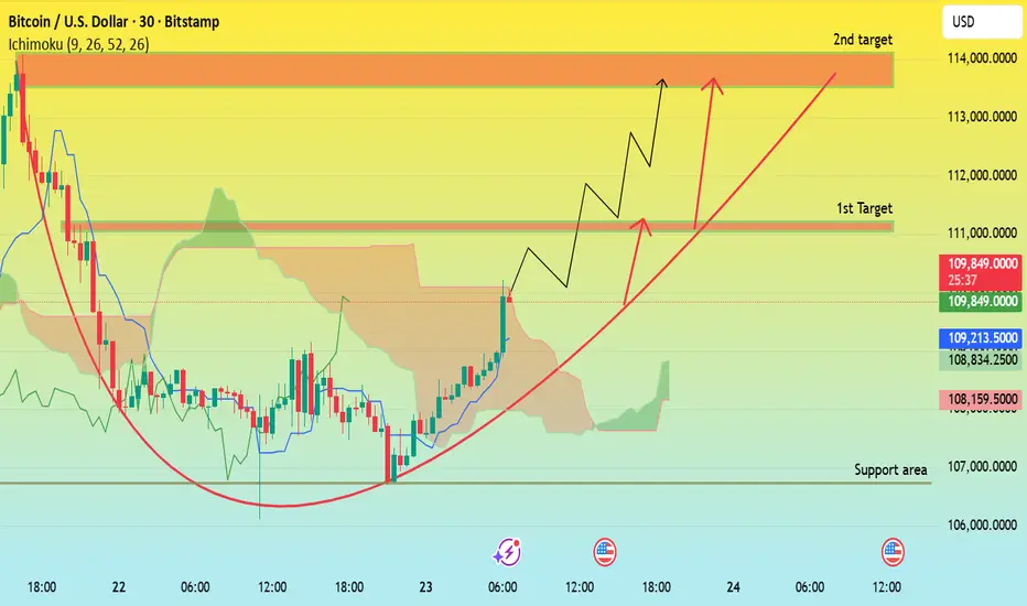 Bitcoin is forming a cup-shaped recovery pattern after a deep correction from the $114,000 area. The price has rebounded strongly from the $107,000 support zone, confirming buyer strength. It is now trading around $110,000, moving above the Ichimoku cloud — a signal of early bullish reversal.