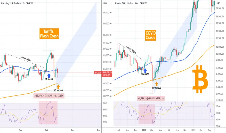 Quick answer: strength/ aggression wise no. Last Friday's crash marked 'just' a -18.34% decline from its top on a week basis. COVID's crash, which was longer admittedly, pulled the price down by -62.95% from February's 2020 High. Massive difference in market psychology and dynamics (even though we may have not seen the last of the current Tariff Crash). And that is the reason one chart is on the 1D time-frame and the other on the 1W time-frame.