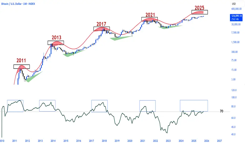 The monthly RSI is back above 70 and hasn't even settled above the overbought level of 72.