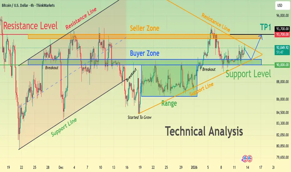 Hello traders! Here’s my technical outlook on BTCUSD (4H) based on the current chart structure. Bitcoin is trading within a broader bullish structure after reclaiming key levels and breaking above previous consolidation zones. Earlier on the chart, price respected a rising support line and formed a series of higher lows, signaling growing buyer strength. After a brief pullback, BTC entered a consolidation range, where the market paused before continuing higher. This range acted as an accumulation zone, and the subsequent breakout confirmed renewed bullish momentum. Currently, BTCUSD is trading above the Buyer Zone around the 90,000–91,000 area, which aligns with previous resistance turned support. Price recently broke out from this zone and is now consolidating just below the Seller Zone / Resistance Level near 93,700. This resistance also aligns with a descending resistance line, increasing its significance and making it a key reaction area. My scenario: as long as BTCUSD holds above the Buyer Zone and respects the rising support line, the bullish structure remains intact. A clean breakout and acceptance above the 93,700 Resistance Level would confirm continuation toward the next upside target (TP1). However, a strong rejection from resistance could lead to a corrective pullback back into the Buyer Zone before any further attempt higher. For now, price remains compressed between support and resistance, and a decisive move is likely soon. Please share this idea with your friends and click Boost 🚀