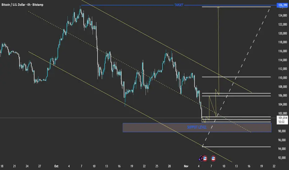 A potential bullish reversal may occur if this support holds, leading to a push toward mid-channel resistance (around 106,000).