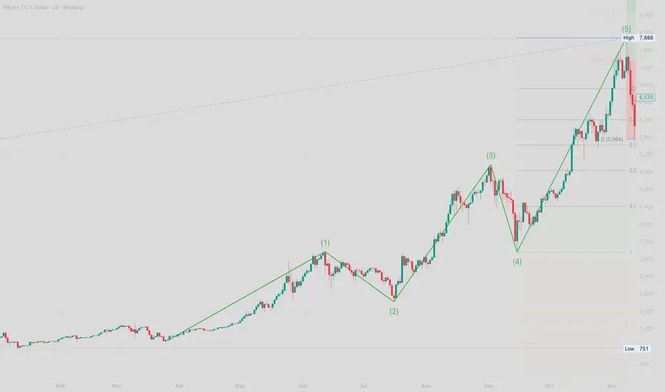 This chart highlights the classic Elliott Wave five-wave pattern seen in Bitcoin’s 2017 bull run: a strong impulsive sequence (waves 1, 3, and 5) bracketed by healthy corrections (waves 2 and 4).