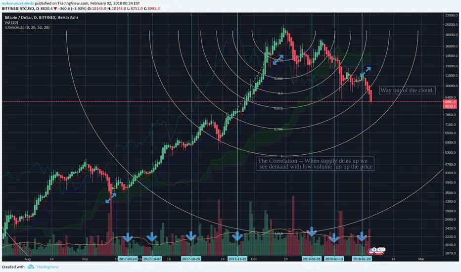 Here I am investigating the trend of BTC when we see it return to a low volume state. The main indicators here are volume based - only the fibonacci resistance arc doesn't follow the volume.