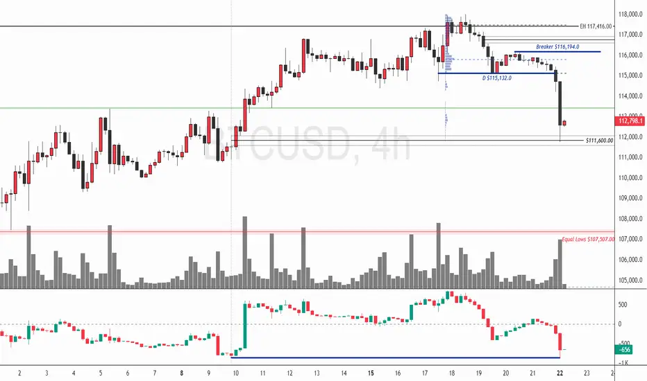 The short-term trend remains bearish due to displacement below $115,132.00 and active bearish FVGs. BTC/USD may consolidate near resistance before resuming its downtrend. If price rises toward the low-volume node near $115,132.00 and holds bearish momentum, it could target the equal lows at $107,507.00.
