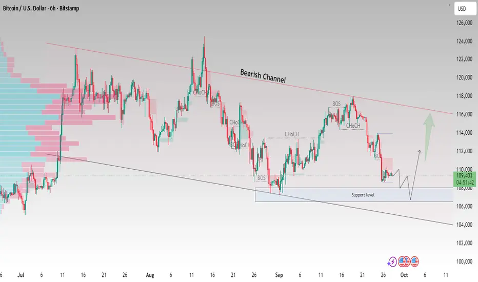 Bitcoin (BTCUSD) continues to trade within a clear bearish channel on the 6H timeframe. The market has respected both the upper and lower boundaries of this channel multiple times, forming a structured downtrend.