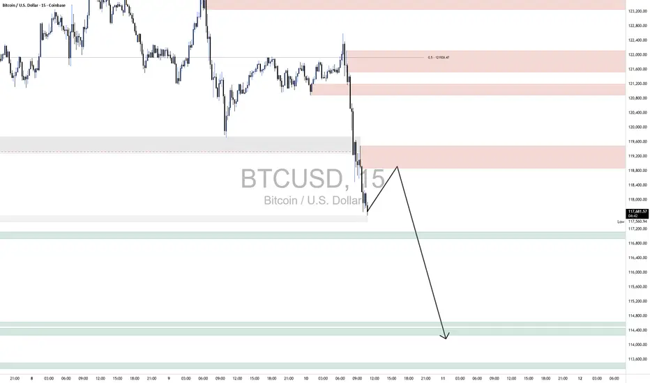 The broader market structure on BTC/USD (15-minute) is firmly bearish, confirmed by a decisive Change of Character (CHoCH) around 119,400, where price broke below a prior higher low and initiated a structural shift. This was followed by strong impulsive downside movement, confirming that sellers are now in control. The previous bullish structure has been fully invalidated, with clear lower highs and lower lows forming as price continues to respect supply levels while failing to hold at short-term demand zones.