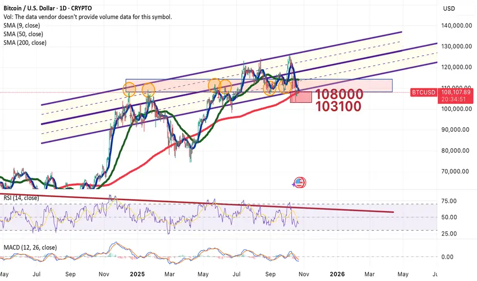Bitcoin is currently hovering around the 200 moving average, near $108,000 — one of the most important levels in every historical cycle.