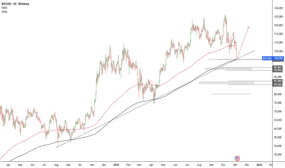 If the price manages to hold above this level, a new upward wave is expected to emerge, initially targeting the 108,000 zone, followed by 115,000 as the second objective. However, if the price breaks below the current trendline, a bearish scenario may unfold toward the demand zone between 95,600 and 93,900, which represents the next key support area.