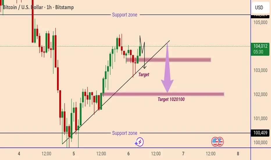 Bitcoin (BTC/USD) is trading around $104,010, showing a mild bullish correction. However, the chart suggests a potential downward move if price breaks below the trendline support. The next targets are around $103,000 and $102,000–$102,100, with a major support zone near $100,400.