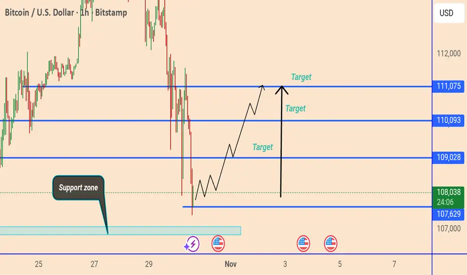 This chart shows the BTC/USD (1-hour) price action with key support and resistance levels. Bitcoin is currently trading near $107,904, slightly above a highlighted support zone around $107,629–$107,000. The analysis suggests a potential bullish reversal from this support, with projected upside targets at $109,028, $110,093, and $111,075.