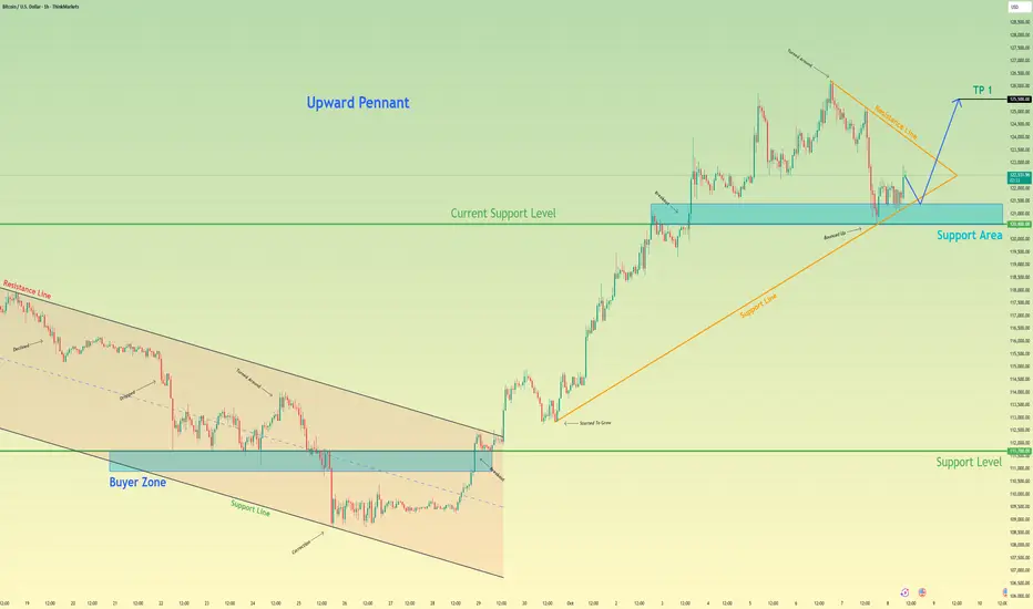 Hello traders, I want share with you my opinion about Bitcoin. The market structure for Bitcoin has recently undergone a major transition from bearish to bullish, following a decisive reversal from the 111700 support level. This shift triggered a breakout from the previous descending channel and gave rise to a new upward pennant pattern, a clear signal of strengthening bullish sentiment. After setting a new all-time high around 126000, BTC has entered a short-term corrective phase, retracing toward the 120600 area, which coincides with both the pennant’s ascending support line and a key horizontal support zone. To me, this pullback looks like a textbook healthy correction within an ongoing uptrend, allowing the market to consolidate before the next move higher. I anticipate that buyers will step in around this level, defending the support and initiating a strong rebound. If the price holds and bounces off the pennant’s support line, it could trigger a bullish breakout, resuming the upward momentum. Based on this outlook, my TP target remains set at 125500. Please share this idea with your friends and click Boost 🚀