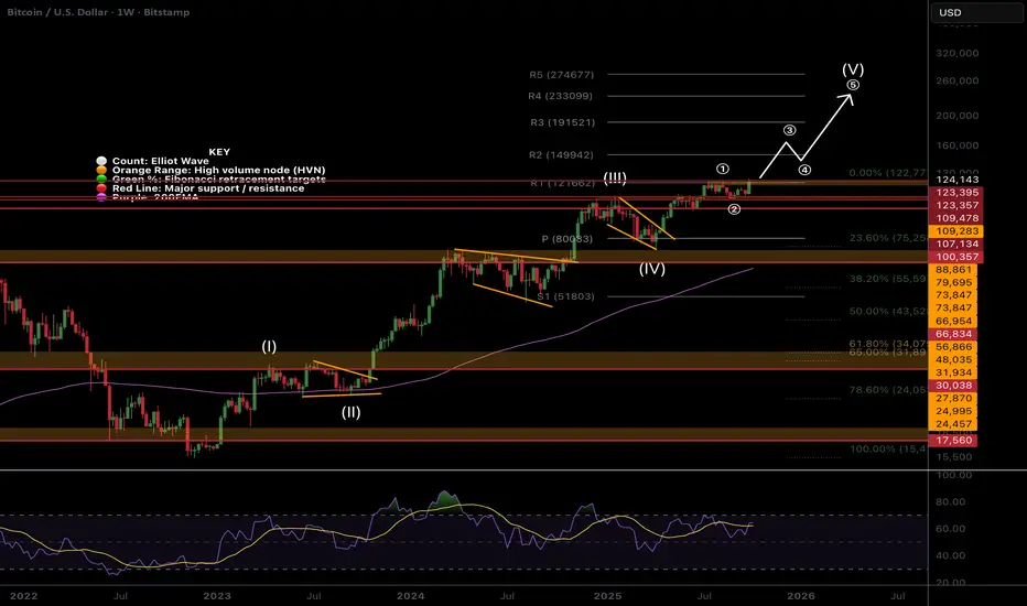 The R2 weekly pivot is the first target at $150k. Weekly RSI continues to print bearish divergence but has come out of overbought and tested the EQ. It is now crossing bullishly. A push into overbought will negate the bearish divergence.