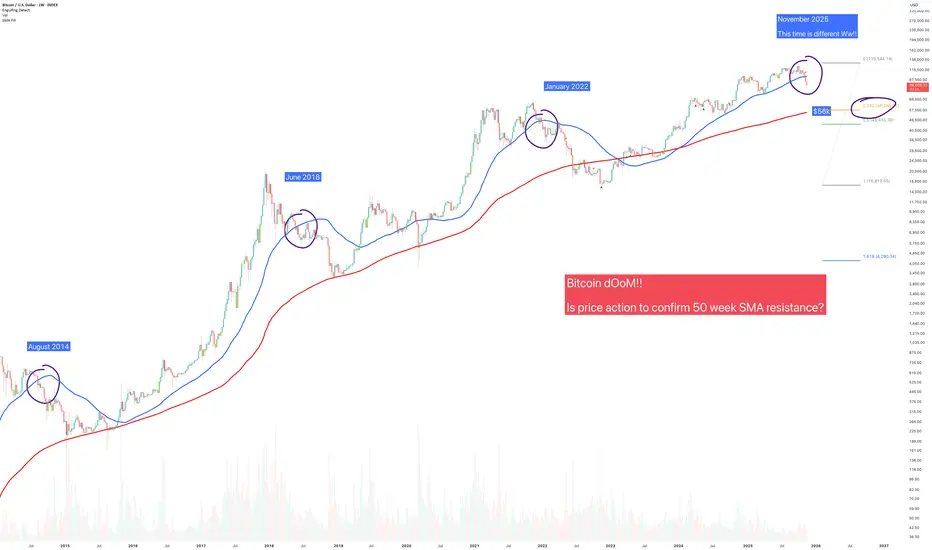 Throughout the history of Bitcoin a test of the 200 weekly SMA occurred every time price action closed under the 50 week SMA. That’s not up for debate, it is a chart fact. Today that would be a highly predictable test of $56k, which is also the Fibonacci 0.38.