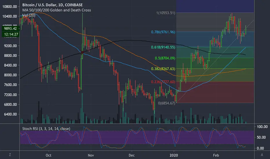 Following up from my previous BTC post I was looking at the possibilities of daily RSI forming a double bottom while the weekly timeframe RSI "cooled off". Fib extension looking to provide support at the .786. If we can do that I would expect to retest the last high around $10.5k. Bearish scenario could take us back to the $9,200's. Really is just about finding the best time to buy right now. Hype fuse isn't even lit yet.. Your grandma will be shilling coinz in the next bull cycle... could be sooner than later.