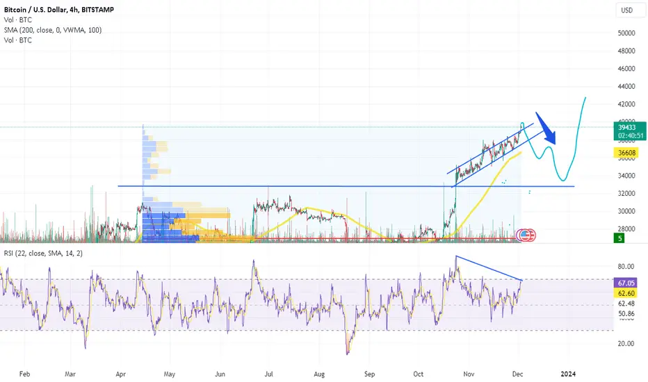 Bitcoin has some bearish confluences at the 4H including an ascending channel, RSI divergence and decreasing volume.