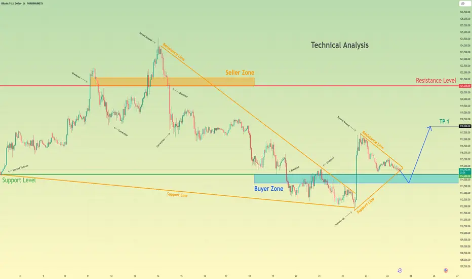 Hello traders, I want share with you my opinion about Bitcoin. Following a decisive breakout from a prior downward wedge, Bitcoin entered a phase of balance and consolidation that is currently forming a symmetrical triangle. This new market environment signifies contracting volatility, with the price being methodically squeezed between a descending resistance line and an ascending support line. The asset has reached a critical juncture, as it is now at the apex of this formation, where the ascending support line converges with a strong horizontal support level at 114400. The primary working hypothesis is a long scenario, based on the expectation of a 'fake breakdown' or 'liquidity hunt'. It is anticipated that the price may briefly dip below the support line and into the buyer zone to trigger stops before staging a strong reversal. A swift reclaim of the 114400 level would be the ultimate confirmation of this bullish thesis, validating the original uptrend. This reversal is then expected to trigger a significant upward rebound. Therefore, the TP is logically placed at the 118000 level, as this represents a key area of prior price interaction and serves as a prudent first objective for a rally of this nature. Please share this idea with your friends and click Boost 🚀