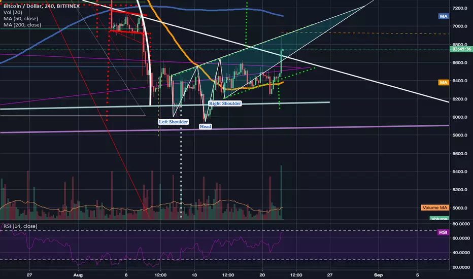 After one of the most massive bullish 4hr volume candles we've seen in a long while, We shot all the way back up to the neckline of the inverted head and shoulder pattern that never quite got invalidated but is now looking rather ugly. Had I been watching the charts when this bullish volume spike occured and saw the rejection I would have exited at the neckline as a very safe spot to then buy back in a few pips above it if it breaks out or accumulate a little more whenever it finds a resting place after getting rejected but I was unfortunately preoccupied with other things and wasn't watching the charts. Either way because of just how massive that volume candle is I have a feeling up will be the path we ultimately head. If this turns out not to be the case and we break down from here I will be prepared and may ladder out small portions but I am optimistic we will hopefully be heading up or sideways at least. The RSI on the 4hr seems to suggest we are reaching the overbought zone but I ahve yet to look at it on the 1 day chart.